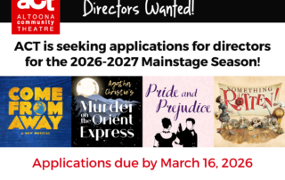 Altoona Community Theatre (ACT), a community-based theater company, is seeking applications for Directors for the 2026-2027 Mainstage Season, presented on the Benzel Stage of the Historic Mishler Theatre. The 2026-2027 season of shows: Come From Away (September 2026) tells the story of over 6,000 airplane passengers who were stranded in a nearly forgotten Canadian airport for five days following the events of September 11th, 2001. What unfolds is a story [...]