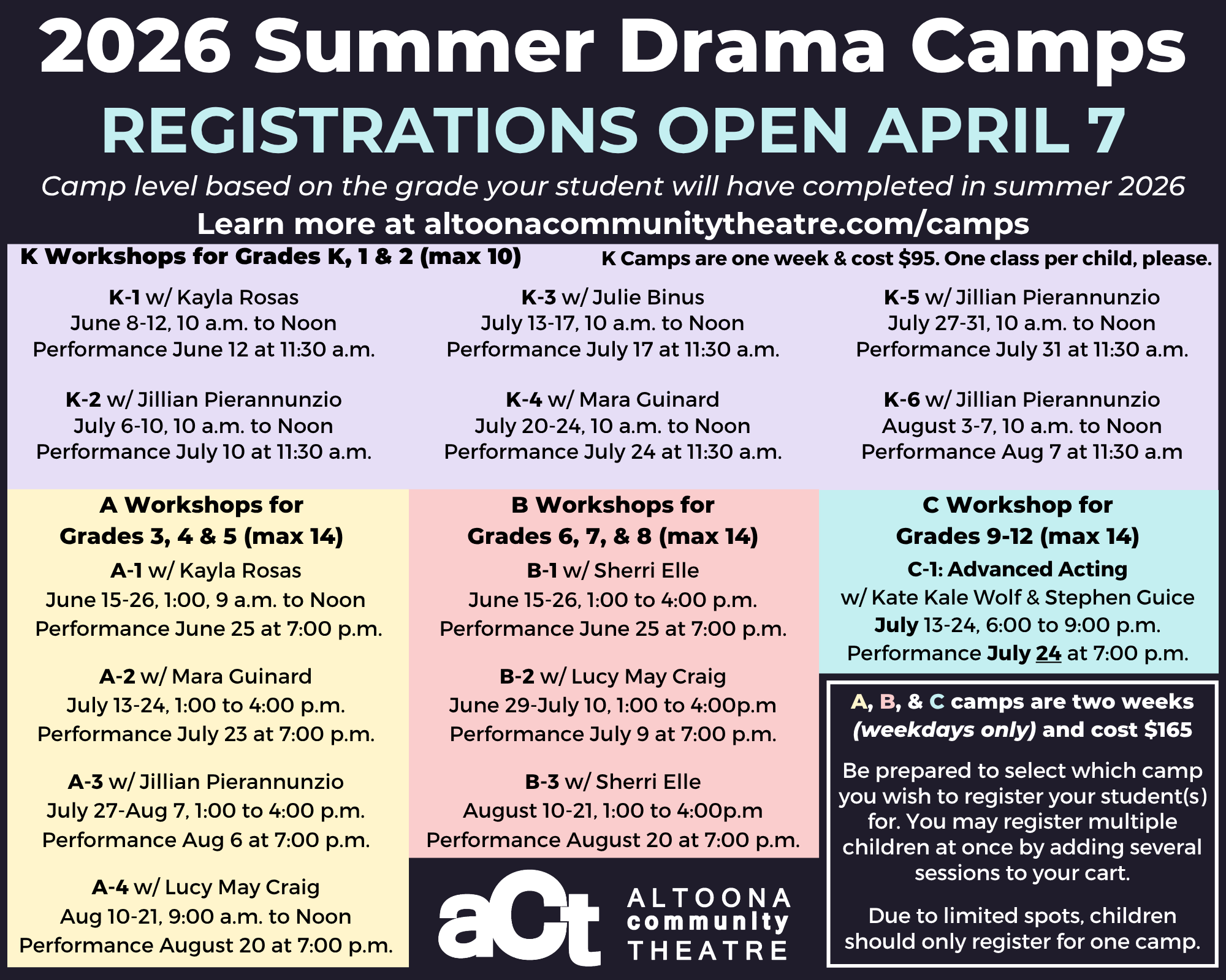 All classes are conducted at ACT’s rehearsal hall at 1213 12th Street (next to Tom and Joe’s Diner and around the corner from the Mishler Theatre).