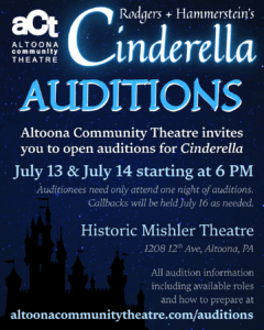 Open auditions for Altoona Community Theatre’s production of “Cinderella” will be held Sunday and Monday, July 13 & 14, beginning 6:00 p.m. in the Historic Mishler Theatre, 1208 12th Street, Downtown Altoona. Auditionees need only attend one night of auditions unless asked to also attend callbacks, which are expected to be held as needed Wednesday July 16 starting at 6 p.m.