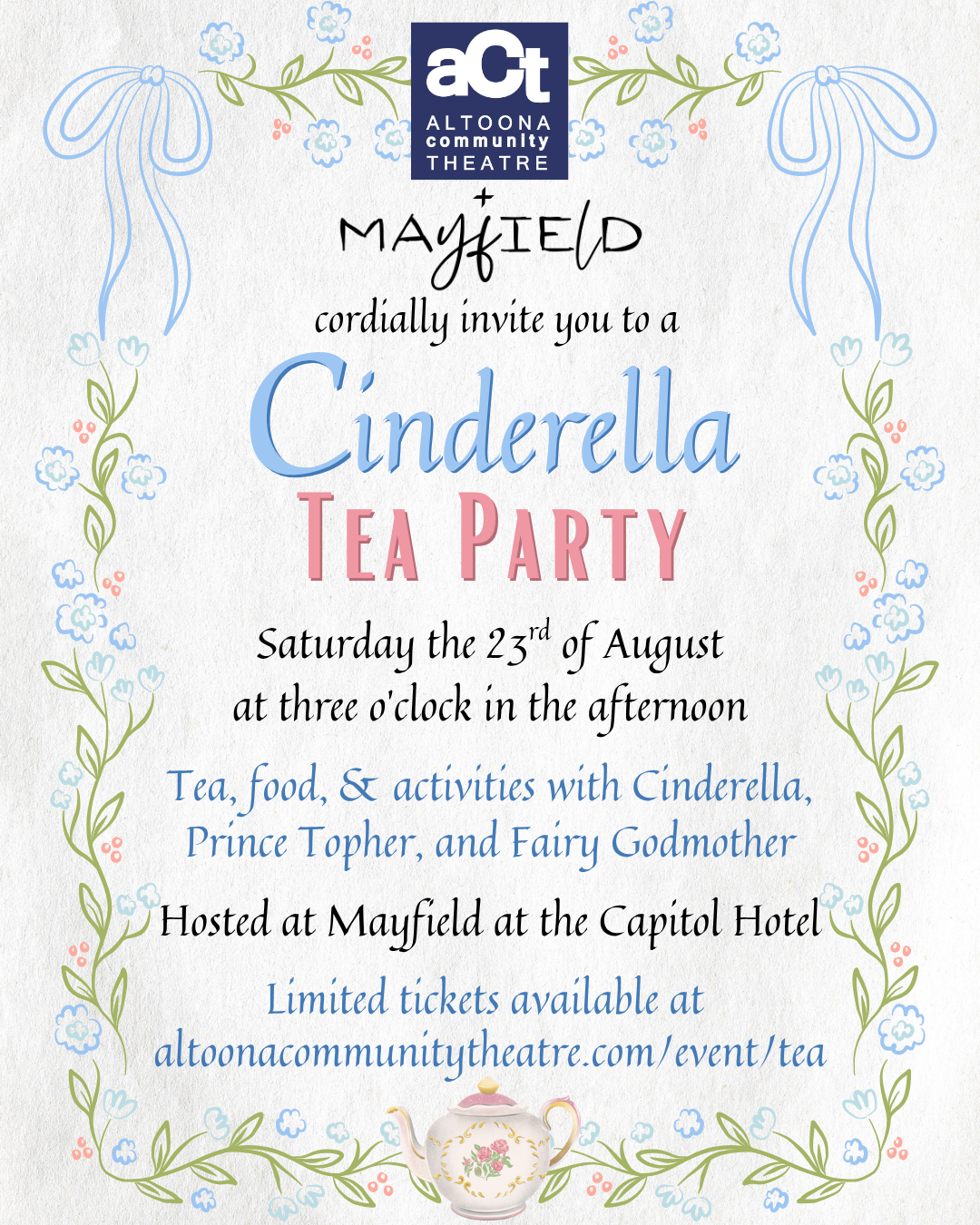 Join ACT for an enchanting afternoon with the characters of Cinderella! Hosted at Mayfield in the beautiful & historic Capitol Hotel on the Hollidaysburg Diamond, this tea party will be a fairy tale come to life for children and their families.